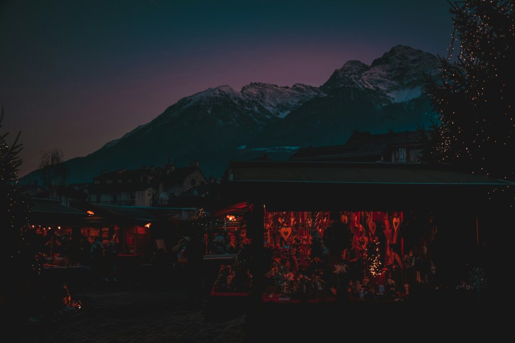 - Alpen-Charme mitten in der Stadt: Der Markt verwandelt die zentrale Piazza Chanoux (2025) in ein idyllisches „alpines Dorf“: mit Holz-Chalets, winterlich dekorierten Tannen und Holzobjekten entsteht eine stimmungsvolle Berg-Atmosphäre mitten in Aosta. Mit der umgebenden Alpenlandschaft und der historischen Altstadt ergibt sich eine Kombination aus Bergromantik und städtischem Ambiente — eine Mischung, die viele Besucher besonders reizvoll finden.
